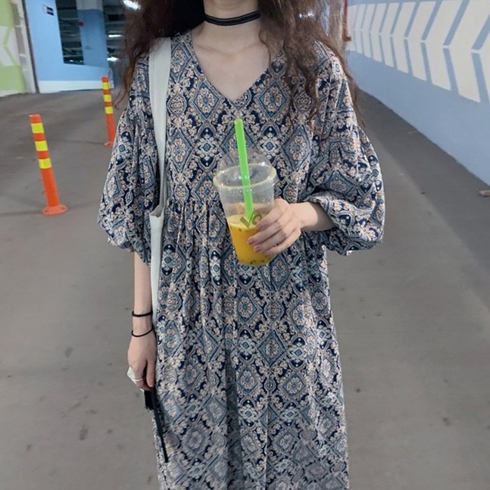 여성 봄 가을 데일리 나들이 휴양지 바캉스 패턴 벌룬핏 롱 원피스 에스닉벌룬원피스